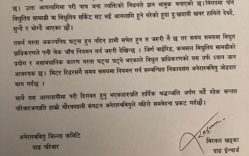 अनेरास्ववियु द्धारा आगलागी घटना प्रति दुःख ब्यक्त