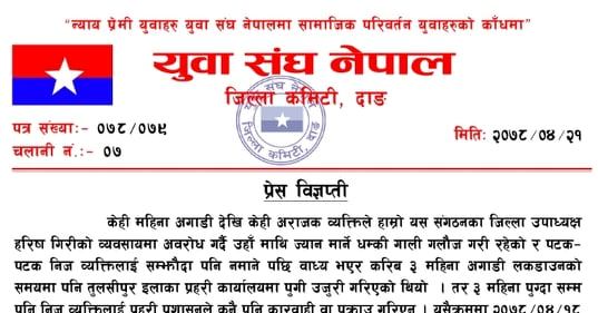तुलसीपुरका इनिस्पेक्टर शर्मालाई कारबाही गर्न युवा संघको माग