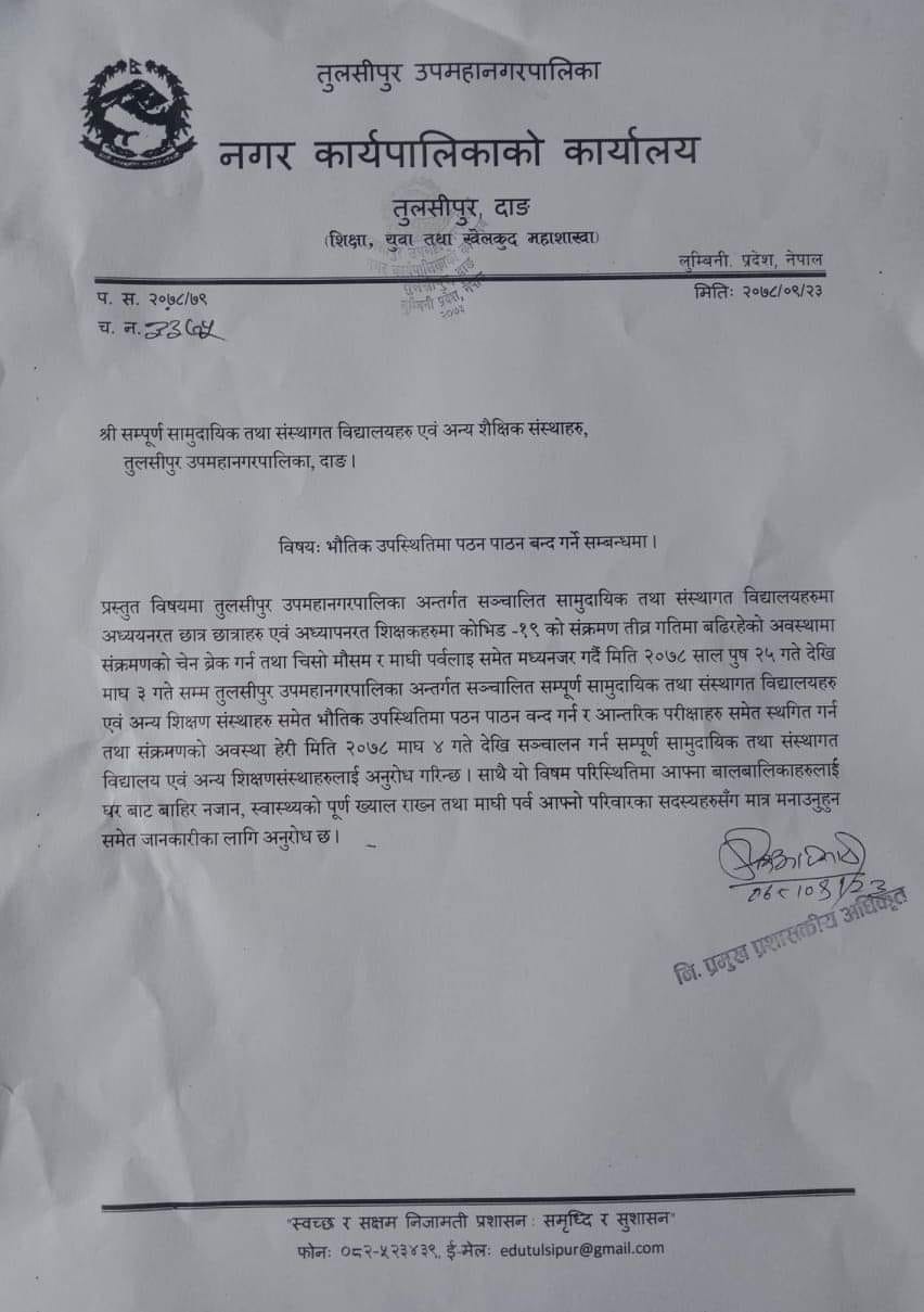 तुलसीपुर, पुस २३ । तुलसीपुर उपमहानगरपालिका भित्रका सबै बिद्यालयहरु नौ दिनसम्म बन्द गरिएका छन् ।