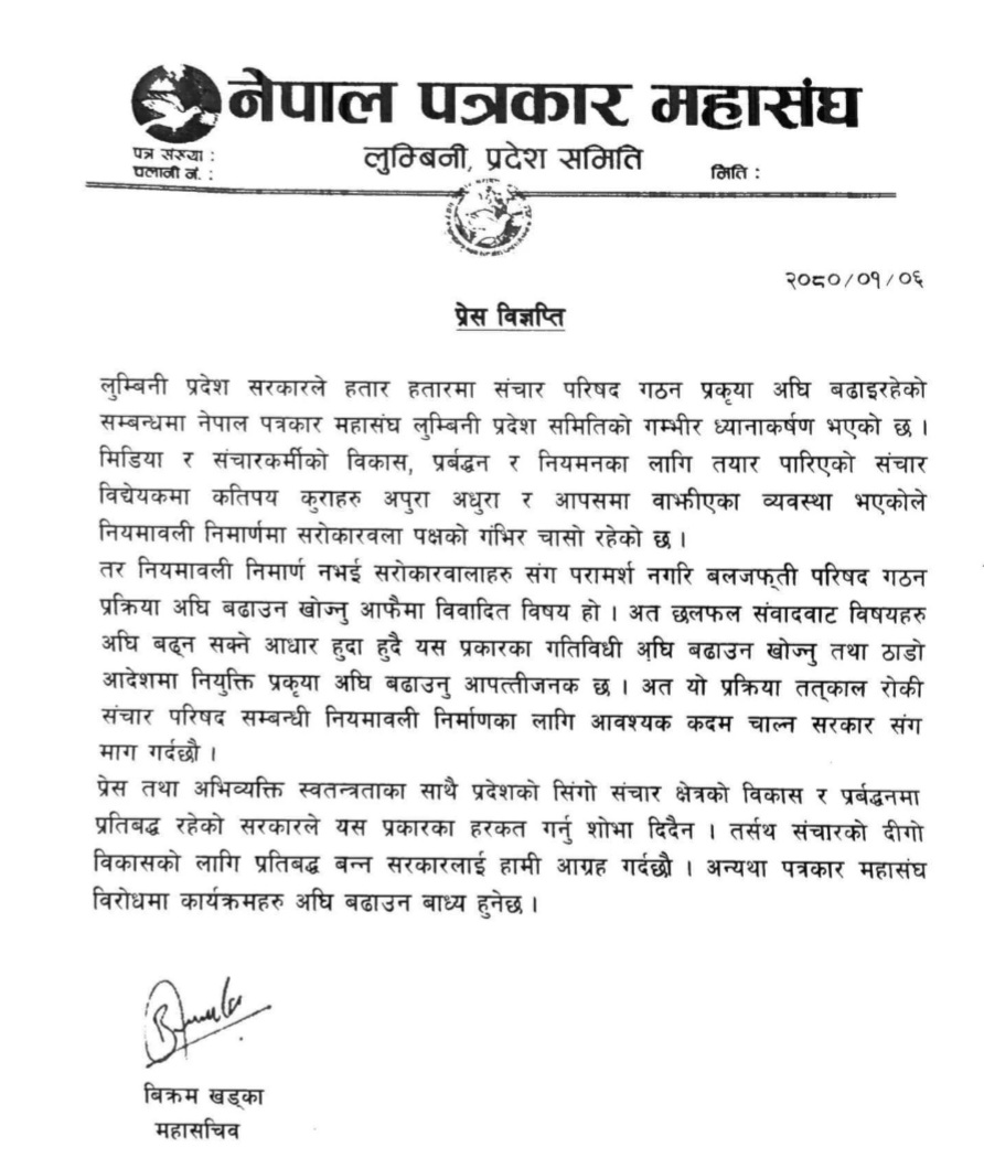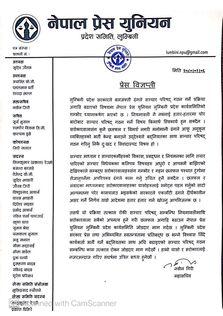 प्रेस युनियन लुम्बिनी प्रदेश महासचिव नवीन गिरीले विज्ञप्ति जारी गर्दै नियमावली नै नबनाई हतारमा प्रतिष्ठान गठन गर्ने प्रक्रिया अगाडि बढाउने कार्य प्रेस युनियनले स्वीकार्य नगर्ने चेतावनी दिएका छन् ।