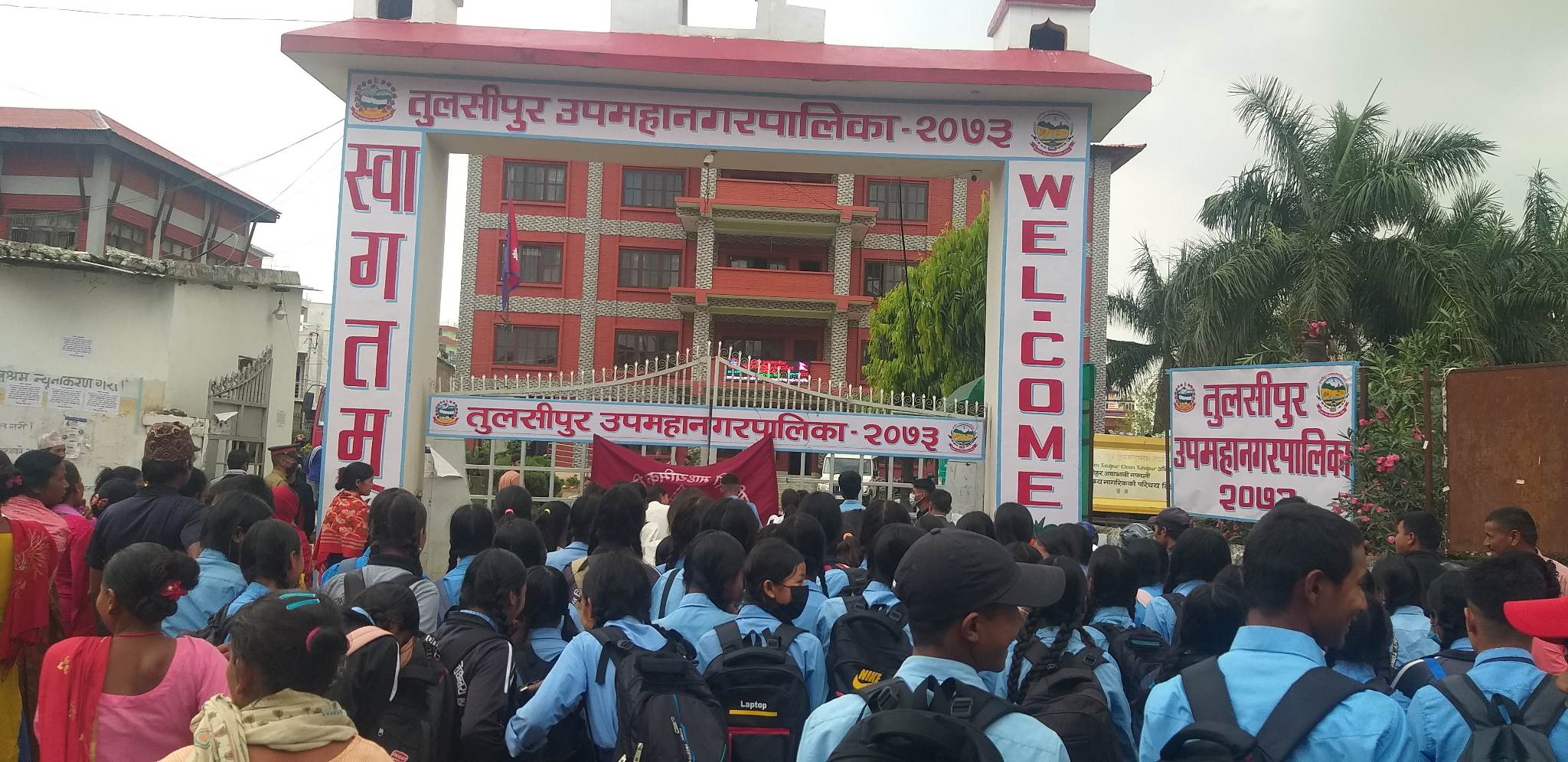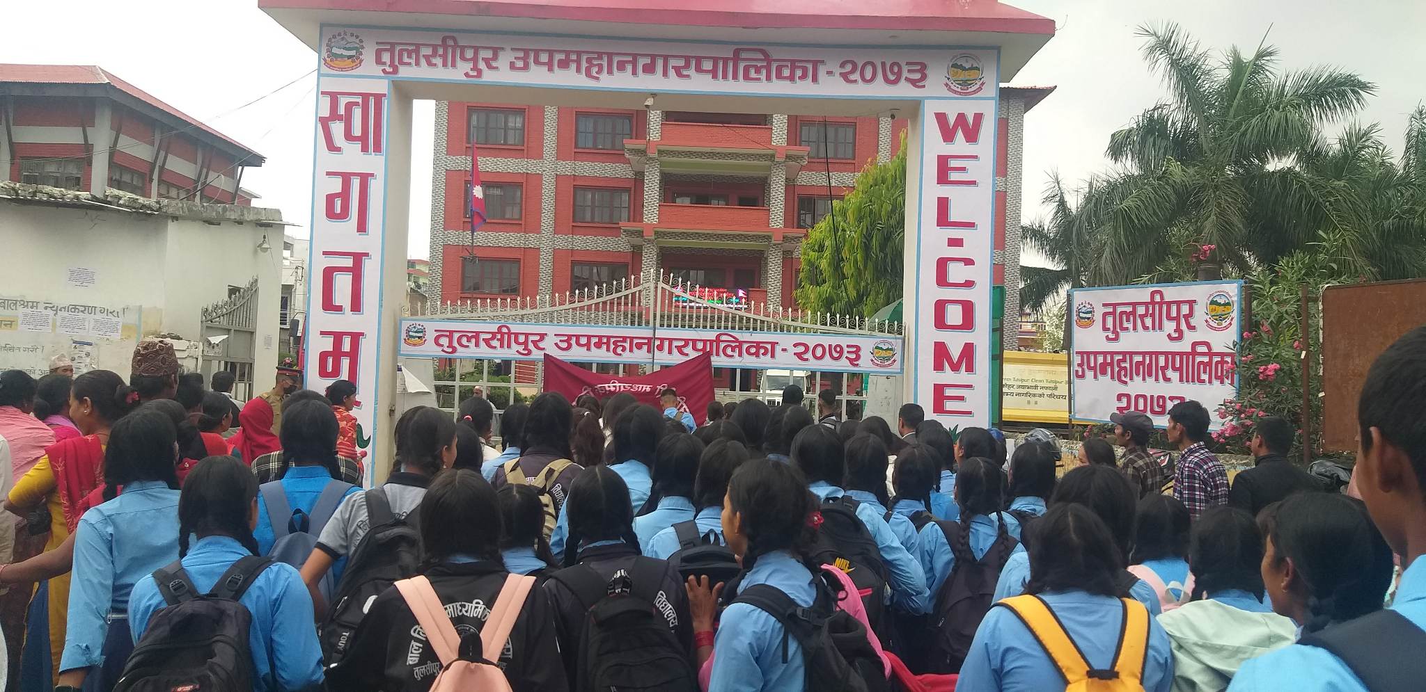 तुलसीपुर , बैशाख १७ । शिक्षकको माग गर्दै तुलसीपुर उपमहानगरपालिकामा आइतबार दिउँसो बिद्यार्थीले घेराउ र नाराबाजी गरेका छन् ।