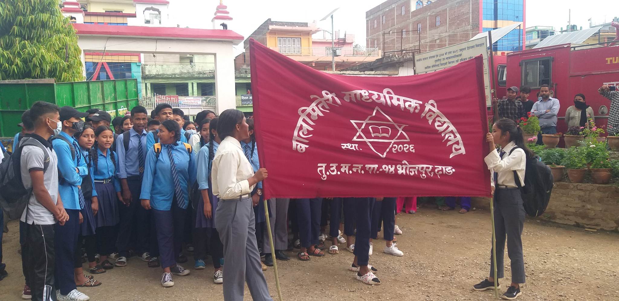 तुलसीपुर – १४ को बालमितेरी भोजपुरबाट आएका बिद्यार्थीले बिद्यालयका तीन शिक्षक टंक केसी, जंग केसी र लेखराज रिजाललाई फिर्ता गर्न माग गर्दै उपमहानगरपालिकामा नाराबाजी गरेका हुन ।