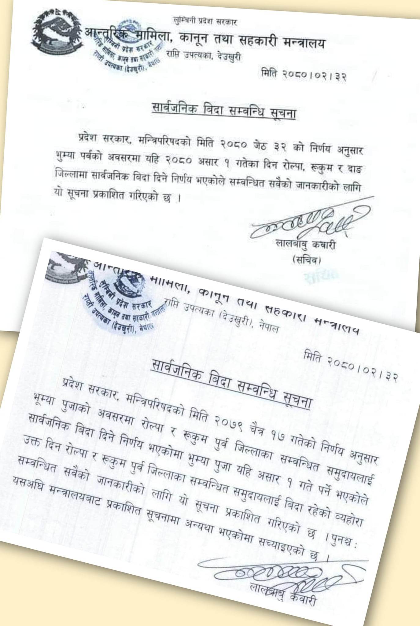 आन्तरिक मामिला, कानुन तथा सहकारी मन्त्रालयको तर्फबाट बिहीबार सचिव लालबाबु कवारीले जारी गरेको पहिलो सूचनामा दाङसहित रुकुम पूर्व र रोल्पा जिल्लामा सार्वजनिक बिदा दिने भनिएको थियो ।