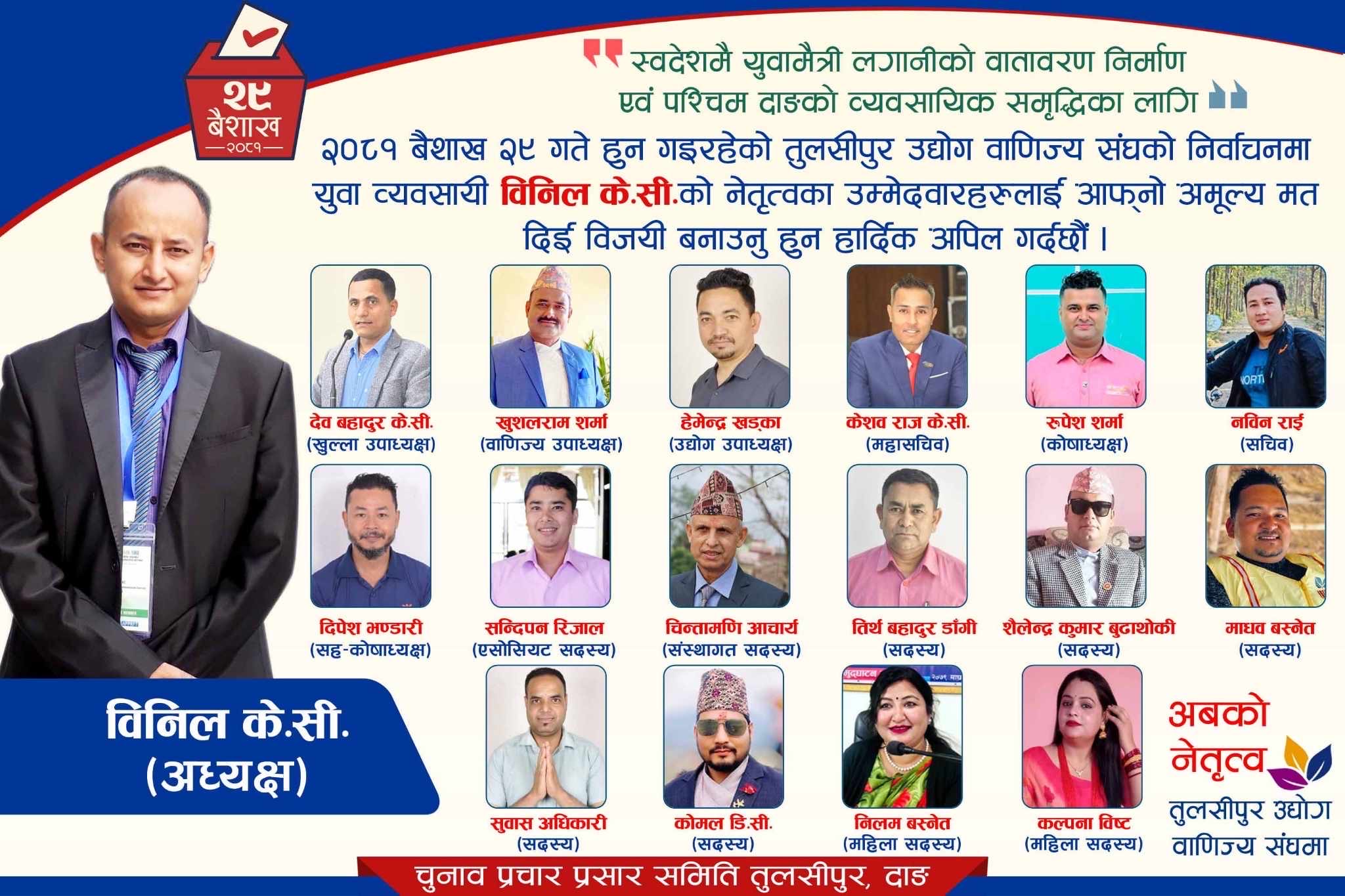 तुलसीपुर, बैशाख २८ । तुलसीपुर उद्योग वाणिज्य संघको नेतृत्वका लागि नेपाली काँग्रेसले आधिकारिक रुपमा सिफारिस गरेका बिनिल केसीले प्रचार प्रशारको अन्तिम दिन शुक्रबारपनि तुलसीपुरको बसपार्क लगायत बजार क्षेत्रमा घर दैलो अभियान जारी राखेका छन् ।