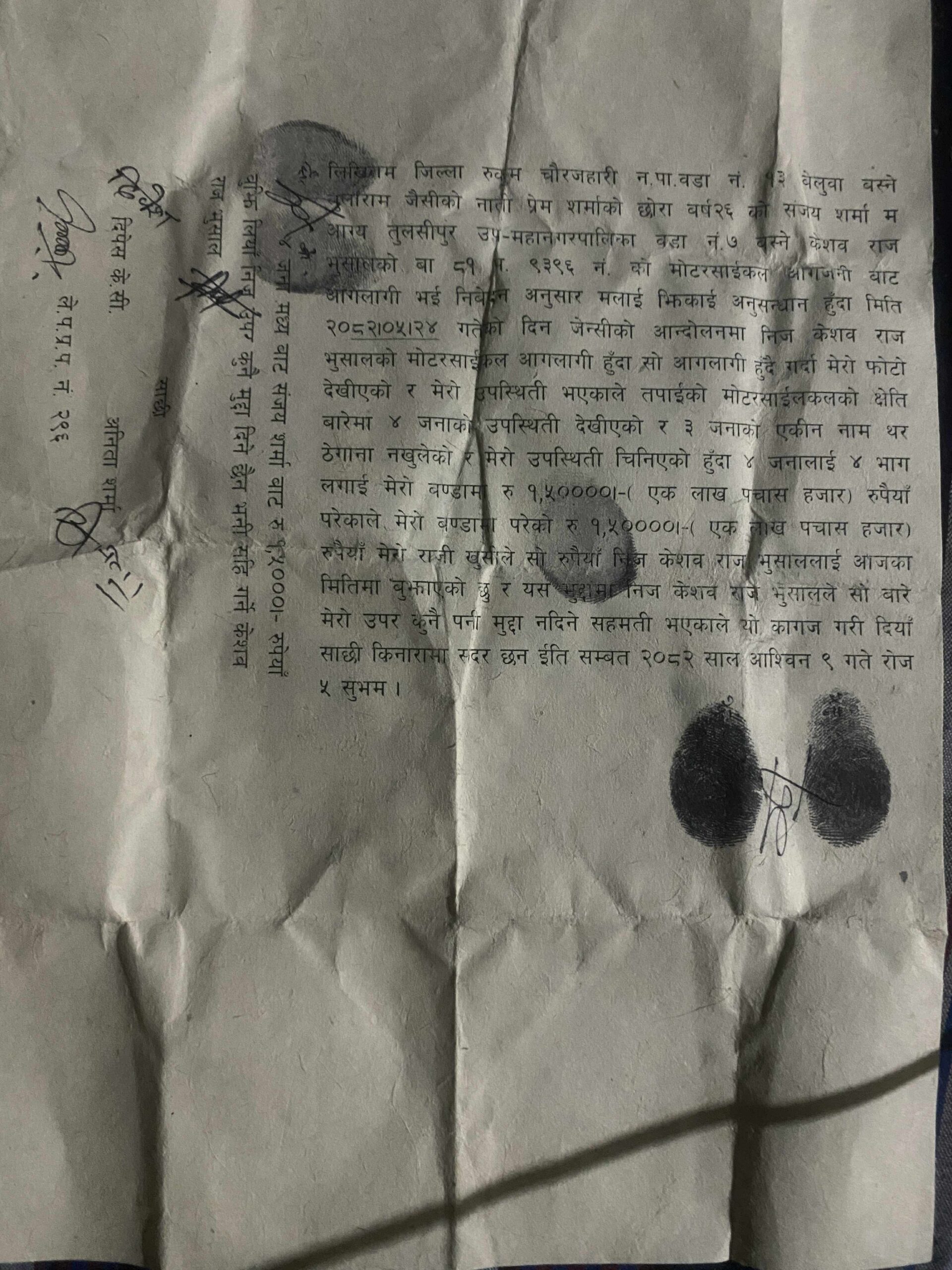 केशव भुसालले आफ्नो मोटरसाइकल जलाउने मध्यका एक जनालाई डेढलाख तिराए