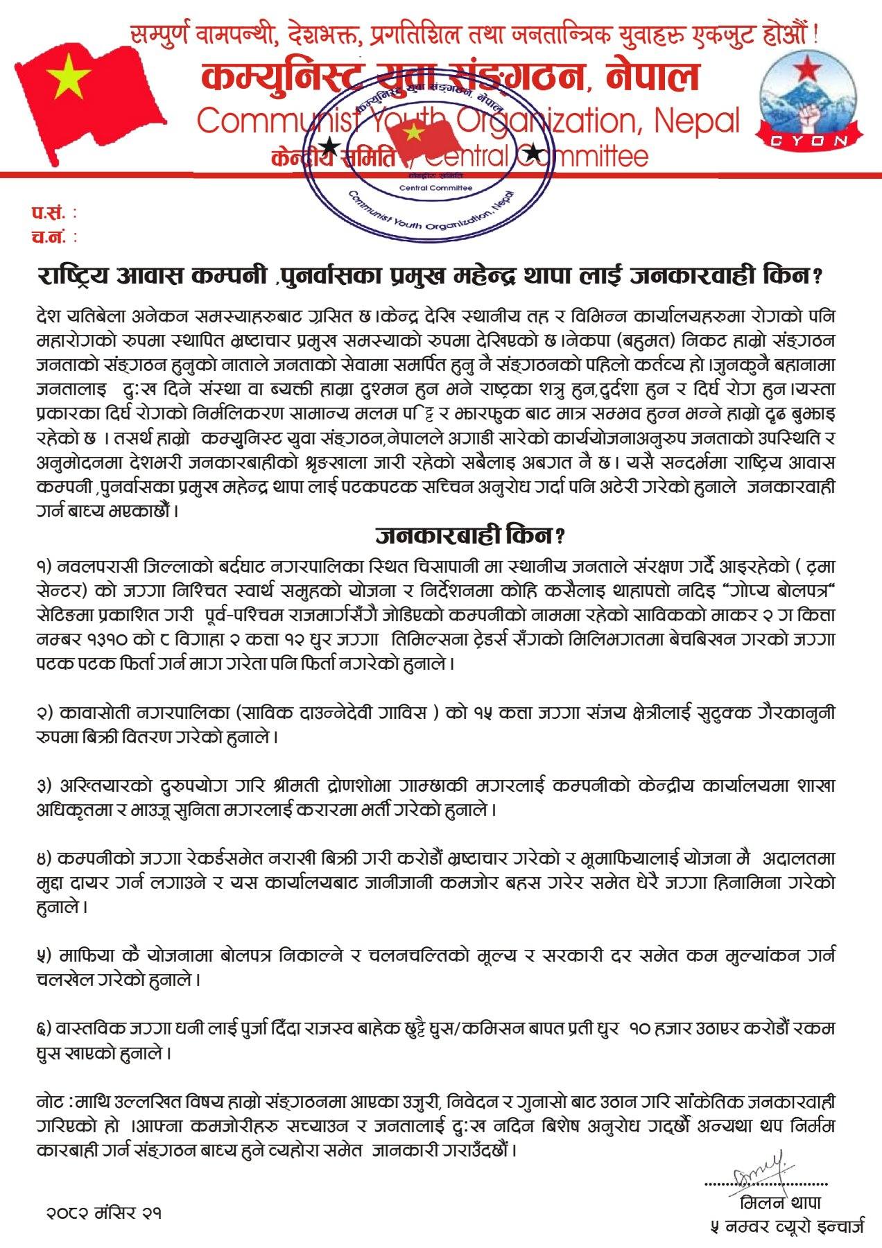 बहुमत निकटको कम्युनिष्ट युवा संगठन, नेपालका ५ नम्बर ब्यूरो इन्चार्ज मिलन थापाले बिज्ञप्ति मार्फत थापा माथि जनकारबाही गरिएको उल्लेख गरेका छन् ।