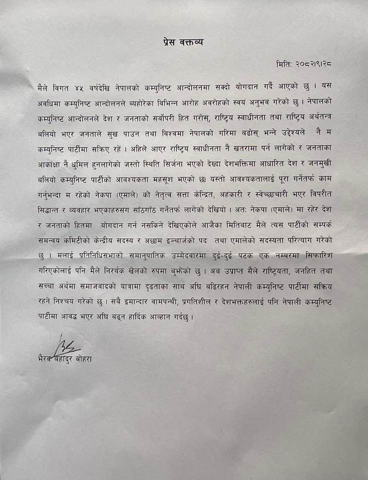 बोहराले एमालेमा रहेर देश र जनताको देश हितमा योगदान गर्न नसकिने देखिएकोले सोमबारदेखि नै लागु हुने गरि एमाले त्यागेको बताएका छन् ।
