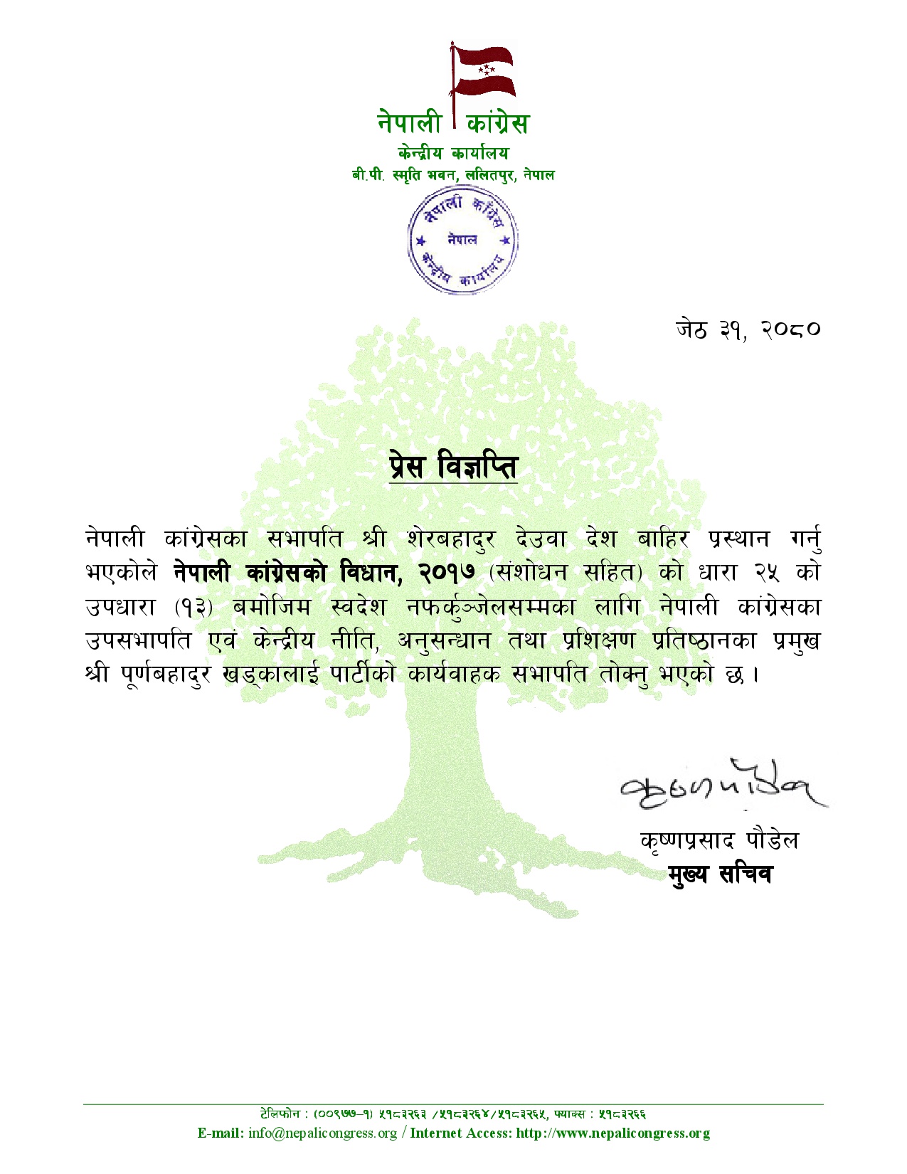 कांग्रेसका विधान २०१७ संशोधनसहितको धारा २५ को उपधारा १३ अनुसार देउवा स्वदेश फिर्ता नभएसम्मका लागि खड्कालाई कार्यवाहक तोकिएको मुख्य सचिव कृष्णप्रसाद पौडेलले बताए ।