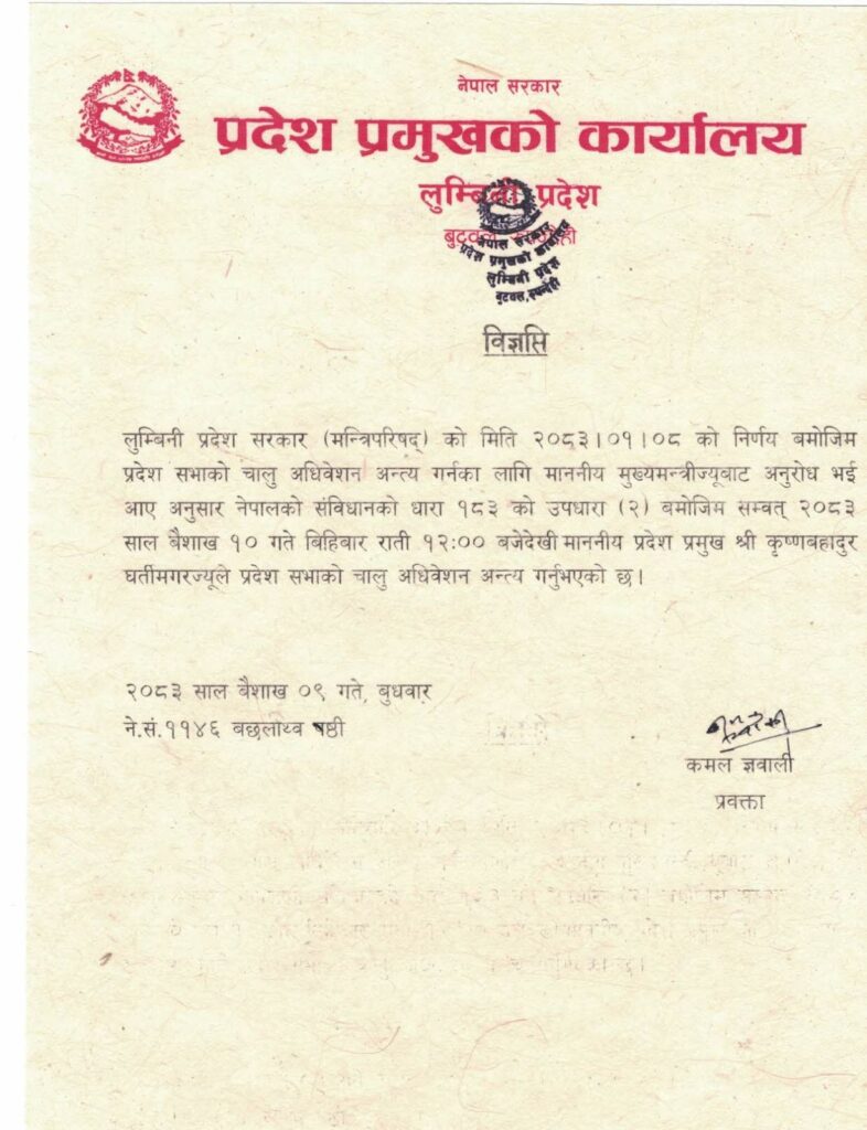लुम्बिनी प्रदेश सभाको चालु अधिवेशन अन्त्य गरिएको छ । प्रदेश मन्त्रिपरिषद्को सिफारिसमा नेपालको संविधानको धारा १८३ को उपधारा (२) बमोजिम प्रदेश सभाको चालु अधिवेशन अन्त्य गरिएको हो ।